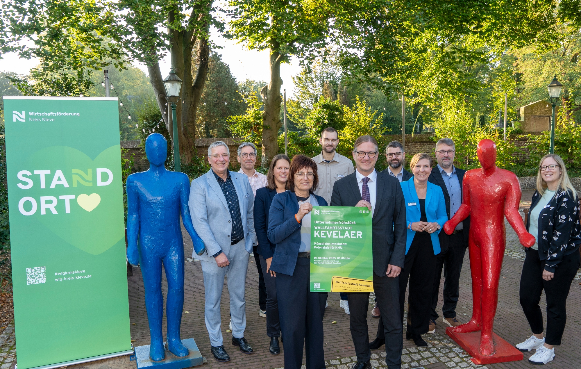 Auch das zweite Unternehmerfrühstück der Wirtschaftsförderung Kreis Kleve in der Veranstaltungsreihe 2025/2026 fand großes Interesse. Im Konzert- und Bühnenhaus Kevelaer begrüßte zunächst der frisch wiedergewählte Bürgermeister Dr. Dominik Pichler die rund 60 Gäste. Er berichtete von anstehenden Aufgaben wie die Fortschreibung des Einzelhandelskonzepts und die Versorgung des Gewerbegebiets „Süd“ mit schnellem Internet. Außerdem stellte der Bürgermeister den Gästen die neue Leiterin der Stabsstelle Kevelaer Marketing, Daniela Cox, sowie den neuen Citymanager Reiner Op de Hipt vor, die beide auch beim Unternehmerfrühstück dabei waren.